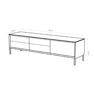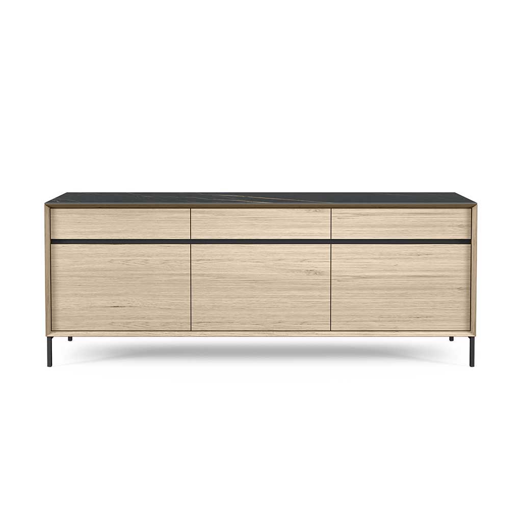Ontdek de Buffetkast Lima. Elegantie en functionaliteit in één. Met drie deuren en 3 laden met telescopische geleiders, MDF met White Wash Oak fineer, 210 cm x 45 cm x 83 cm, unieke zwarte keramische top, en vier gepoedercoate zwarte metalen poten.