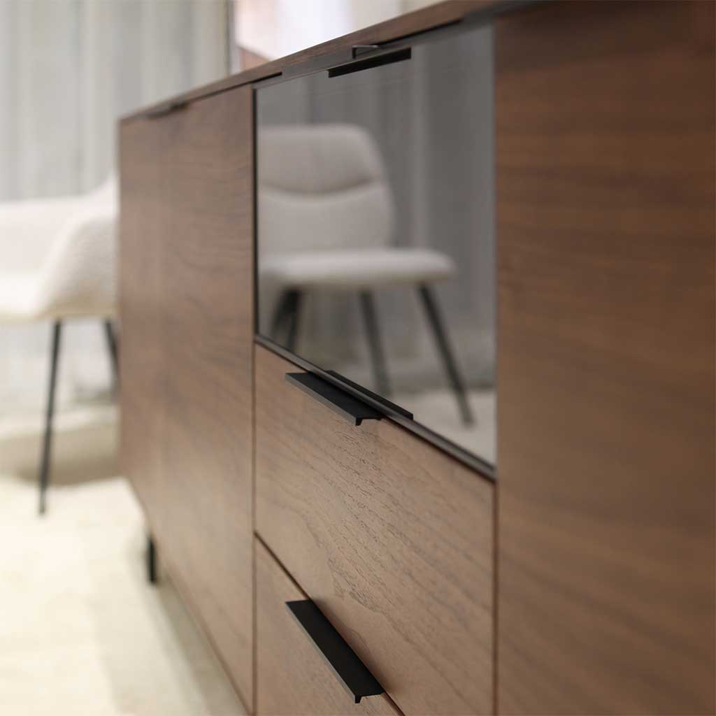 Ontdek de Manilla buffetkast: stijlvol, functioneel en perfect voor elke ruimte. Met ingebouwde LED verlichting, drie deuren, twee laden met telescopische geleiders, en met bovenaan een getemperd glazen klapdeur. Gemaakt van MDF met Walnut fineer, ondersteund door vier gepoedercoate zwarte metalen poten. Afmetingen: 240 cm x 45 cm x 80 cm.