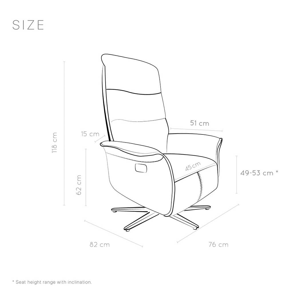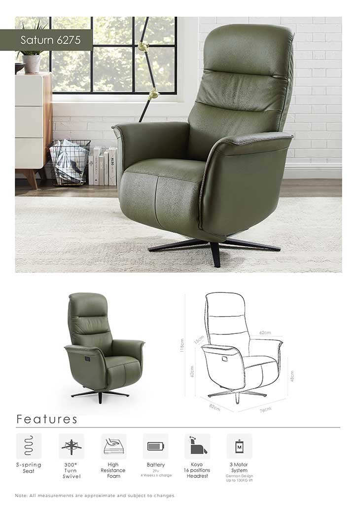 Ontdek de Saturn relaxzetel. Met 3 motoren kunt u eenvoudig de rugleuning, voetsteun en kantelfunctie aanpassen. De manueel verstelbare hoofdsteun en oplaadbare batterij voegen extra gemak toe. De metalen draaivoet met stopfunctie voor de veiligheid. Vervaardigd in kwaliteitstof Bull.
