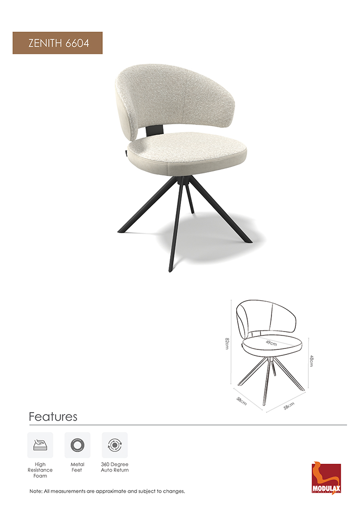 Ontdek de ultieme comfort en stijl met onze eetkamerstoel Zenith. Deze hedendaagse stoel heeft een terugdraaiende zit. Compleet met een zwart metalen draaipoot voor extra flexibiliteit en een vleugje eigentijdse klasse. Gefabriceerd met hoogwaardige stof.